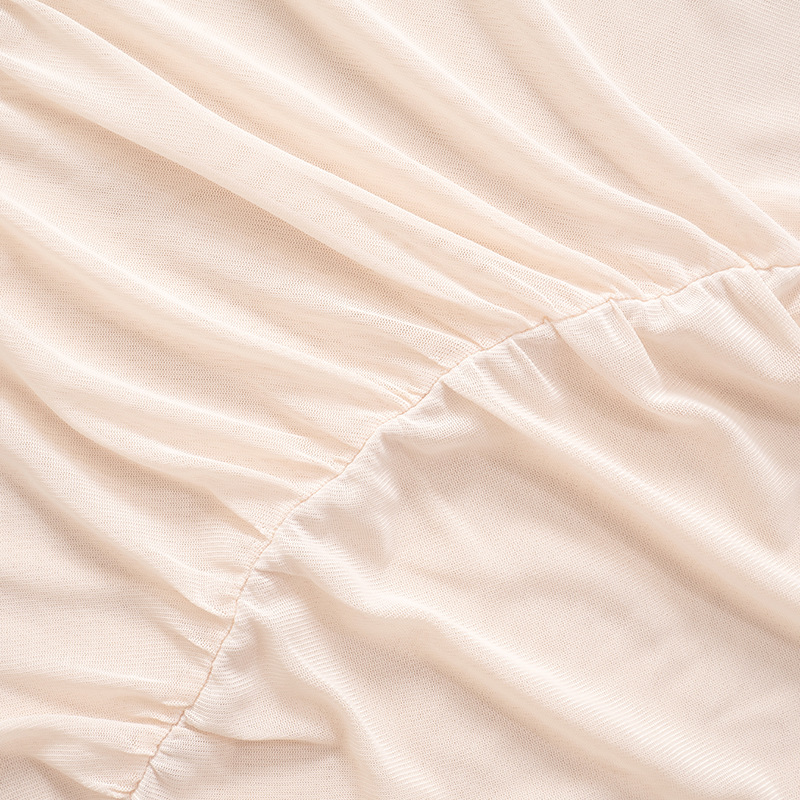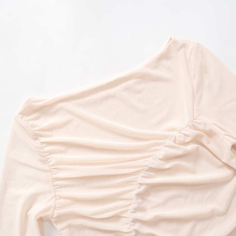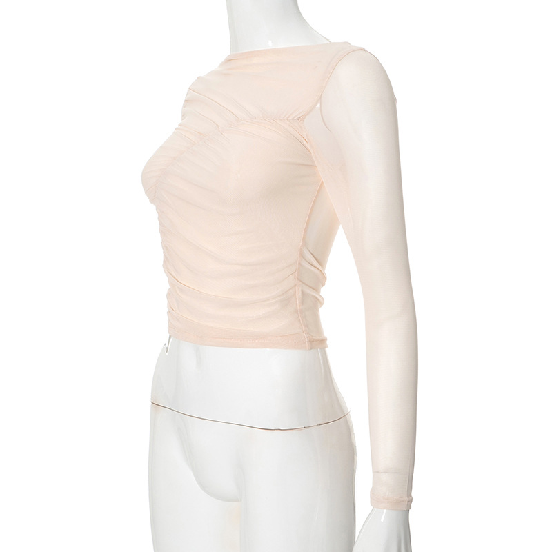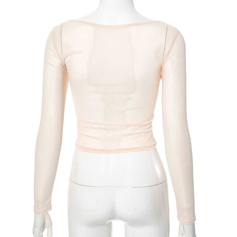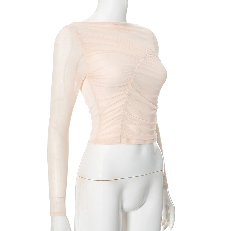 The Ana Mesh Long Sleeve Top is a flirty and sexy piece that brings a touch of elegance to any outfit. With a slim fit and ruched details, this top is designed to accentuate your silhouette. The mesh sleeves add a playful touch, while the solid apricot color keeps it versatile for any occasion. Its cropped length and crew neckline make it easy to style, whether you're going for a casual or dressed-up look. Perfect for layering or wearing solo, this top is ideal for spring and fall.