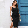 The spaghetti strap neckline adds a delicate touch, perfectly complementing the sleeveless design. This versatile dress can be worn as a maxi dress, split dress, cami dress, or bodycon dress, making it ideal for formal occasions. With a midi length, it offers a perfect balance of sophistication and allure.
